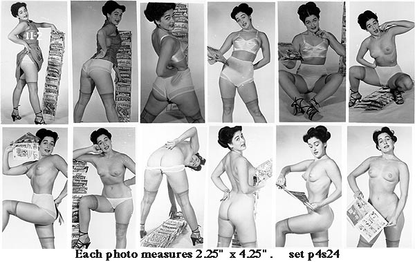 1950s Cheesecake Photos. Complete set of 12 (twelve) 2.25" x 4.25" images of dark haired gal reading 1950s comic books! Black & white, glossy. Original cellophane wrapper. Click on image to see